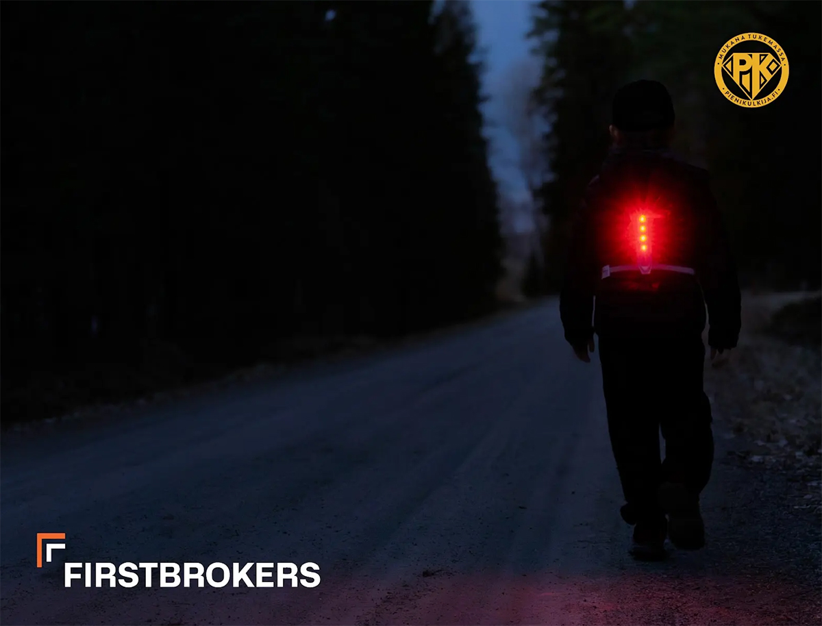 Firstbrokers is participating in the Little Pedestrian campaign, which aims to improve traffic safety for young schoolchildren. In this nationwide campaign, local companies purchase reflective harnesses, which are then donated to schools in the area. At schools, the harnesses are distributed to first-grade pupils to make their journeys to and from school safer, especially during the dark season. The reflective harnesses are also equipped with LED lights, maximizing the visibility of small pedestrians.
